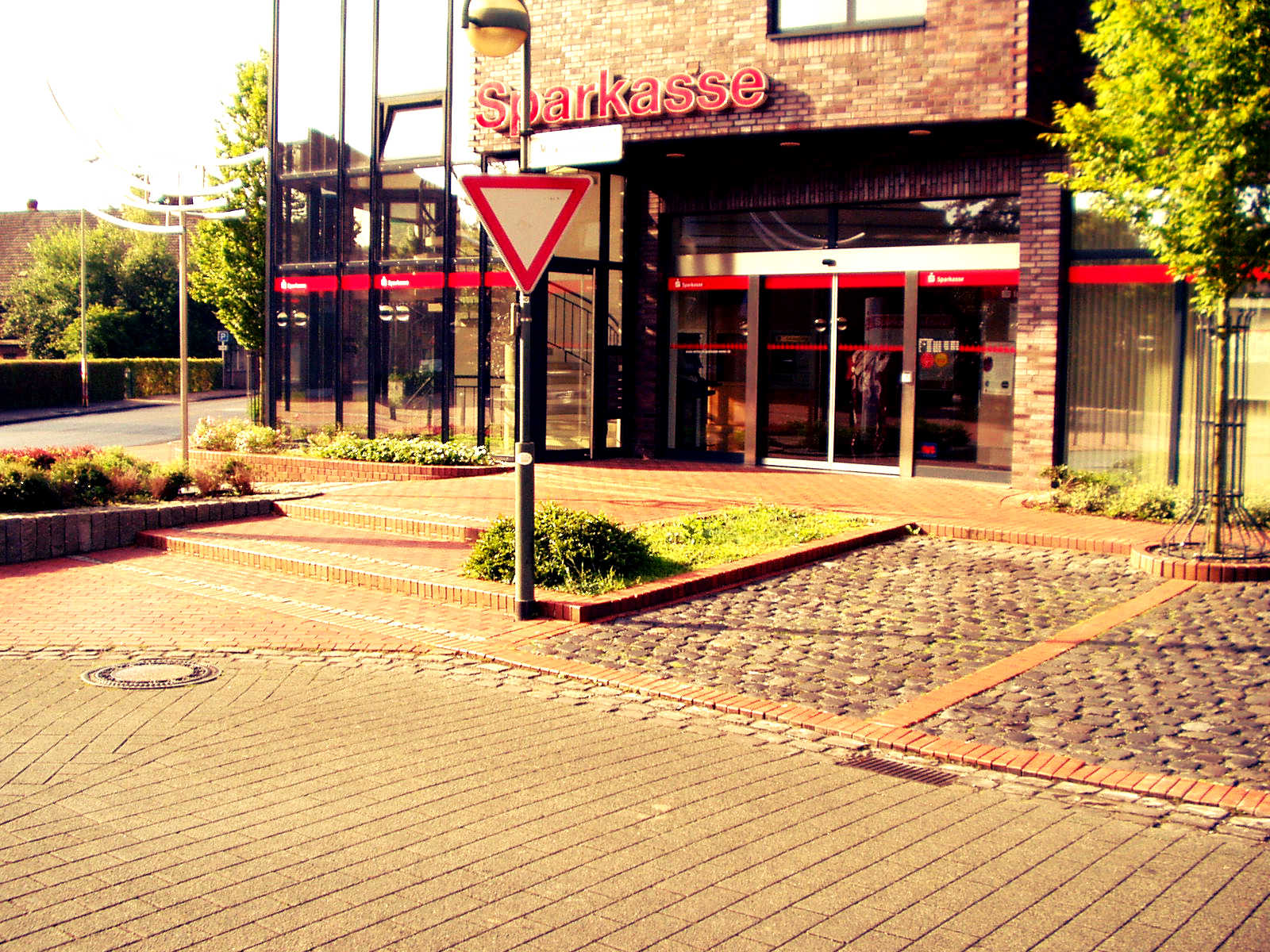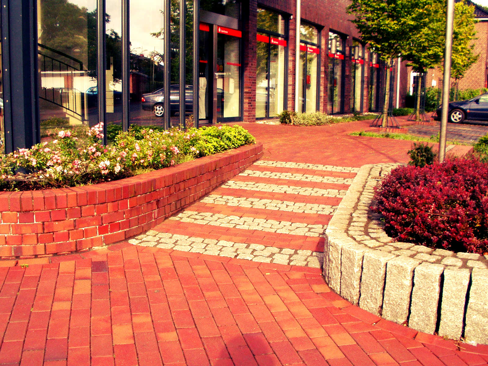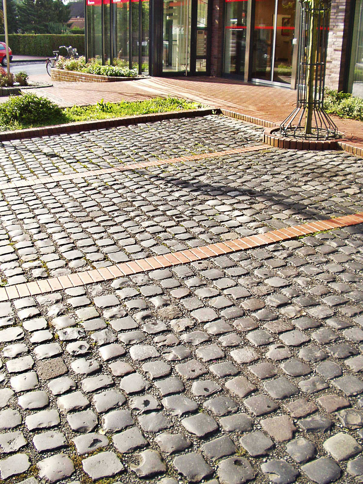 An der Sparkasse in Hamminkeln erstellten wir eine Rampe zum Überbrücken der verschiedenen Ebene.Die Parkplätze wurden aus Basalt Kopfsteinpflaster gefertigt.