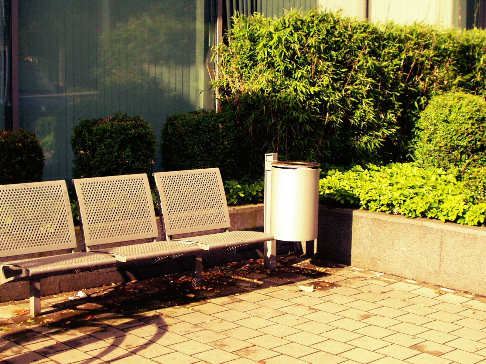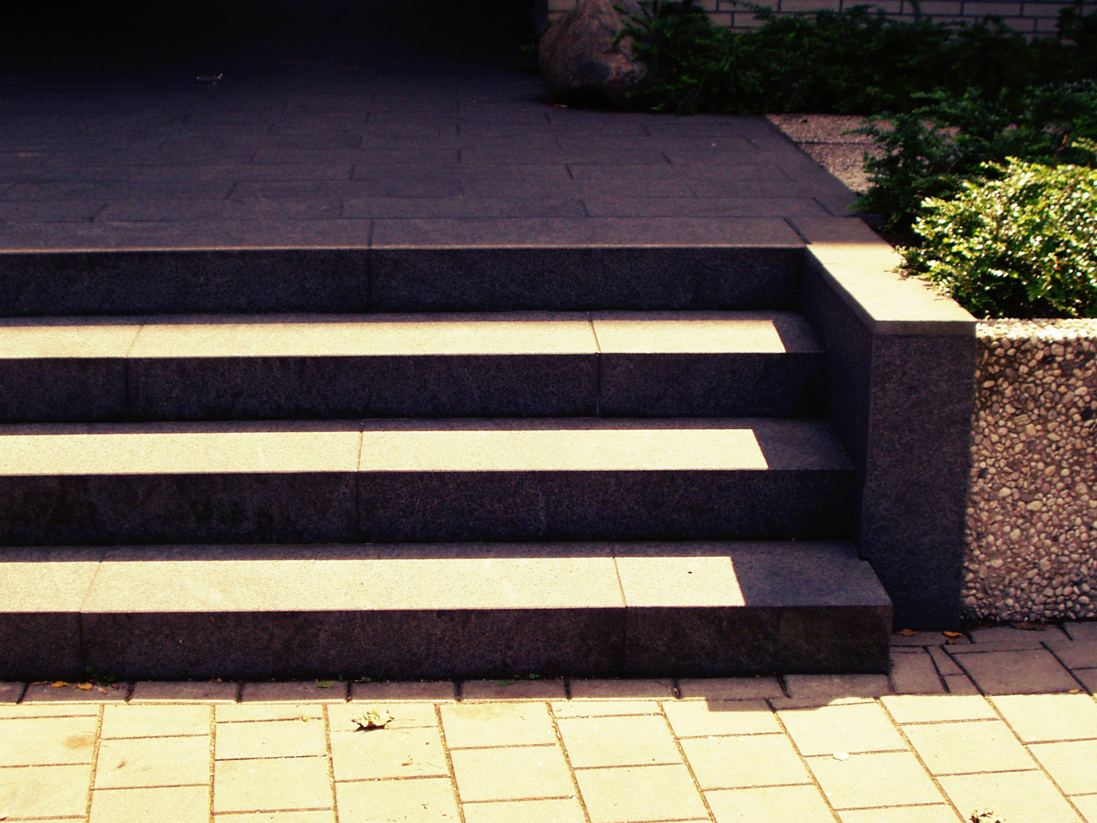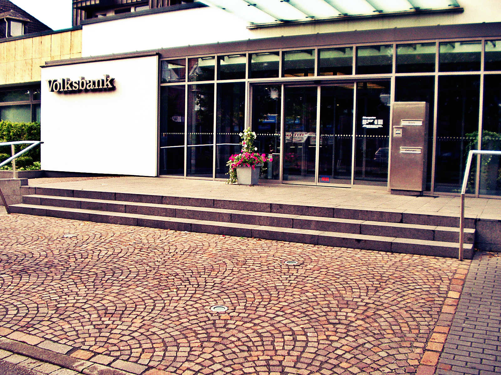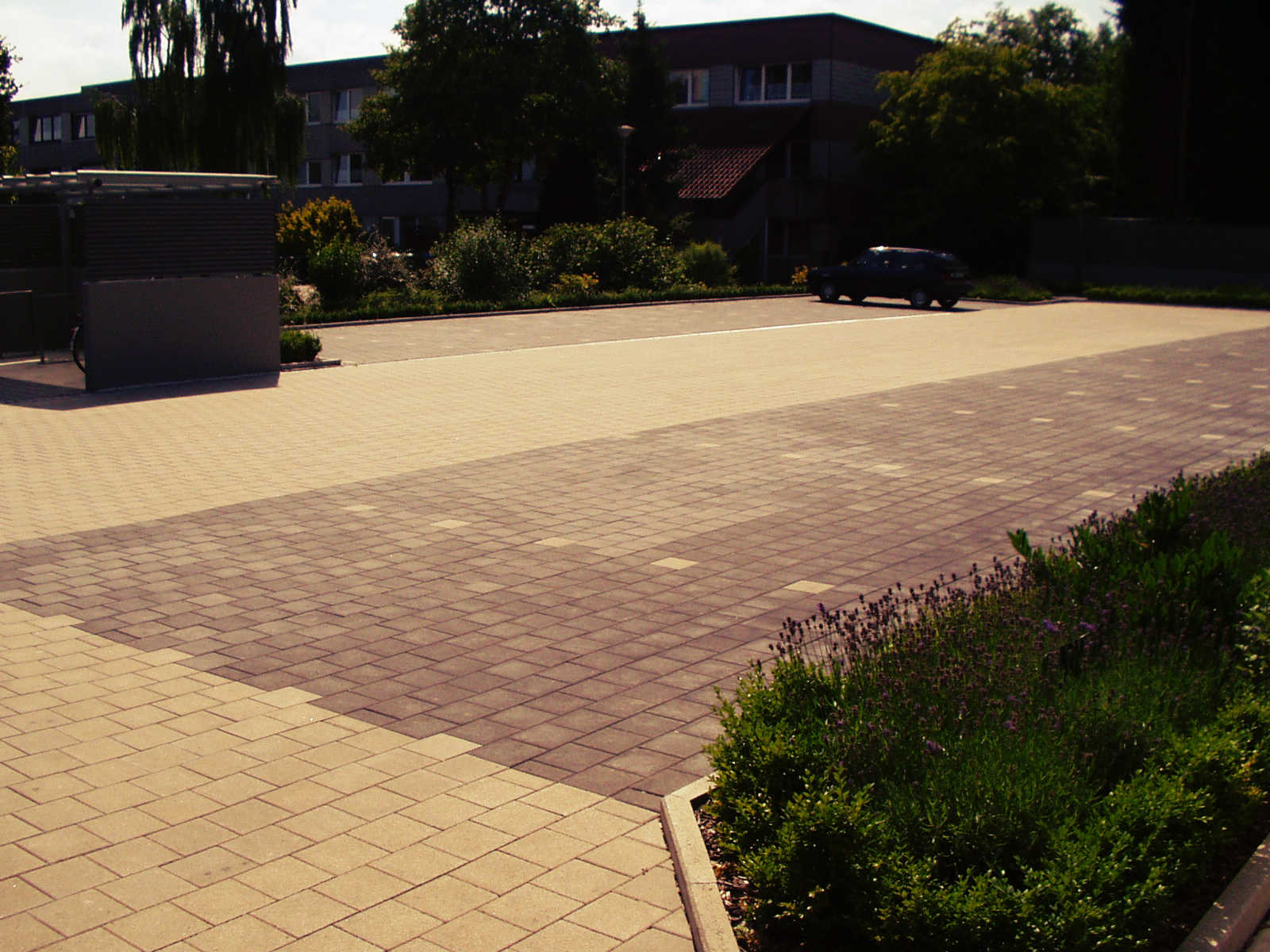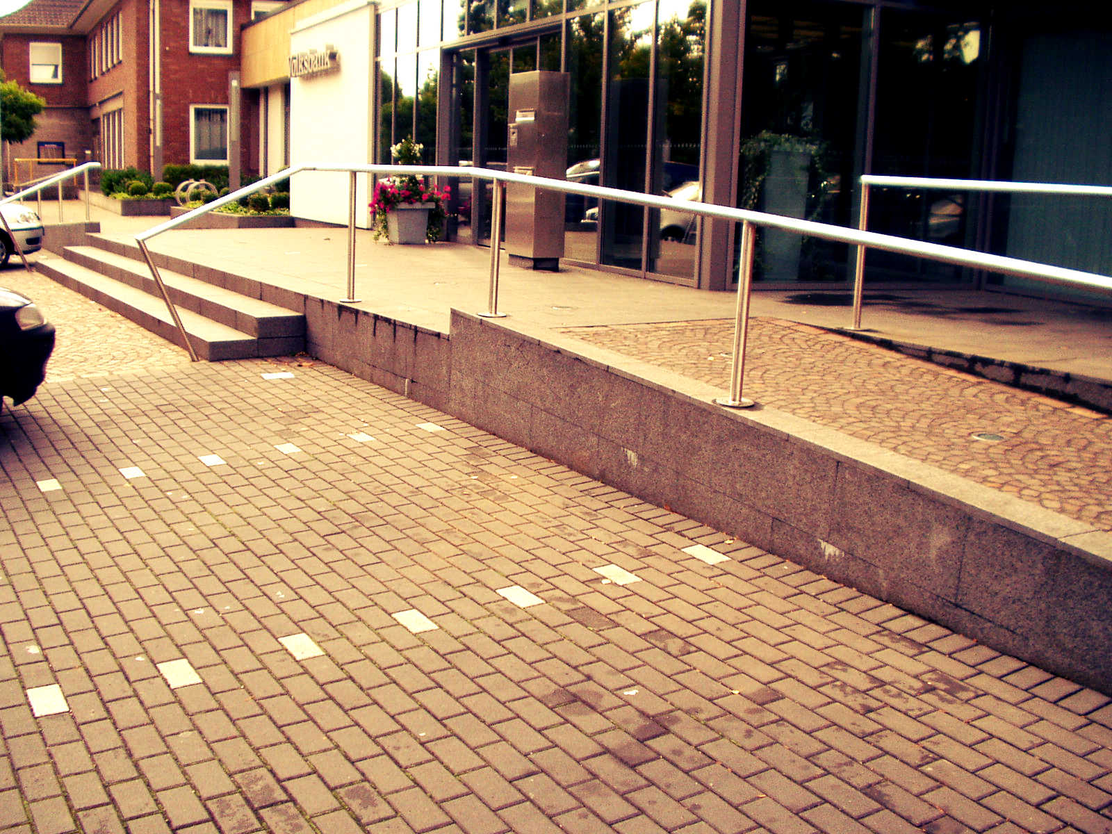 Der Eingangsbereich wurde aus einem Porphyrpflaster im Schuppenmuster gesetzt. Die Treppenanlage wurde aus den Blockstufen "Victorgranit" angelegt. Des Weiteren wurden Parkplätze auf einer Tiefgarage, bestehend aus einer Pflasterung mit einer Integrierung von Grünbeeten, installiert. Für eingeschränkte Kunden wurden Parkreservierungen, mit einem Emblem aus Edelstahl, geschaffen.